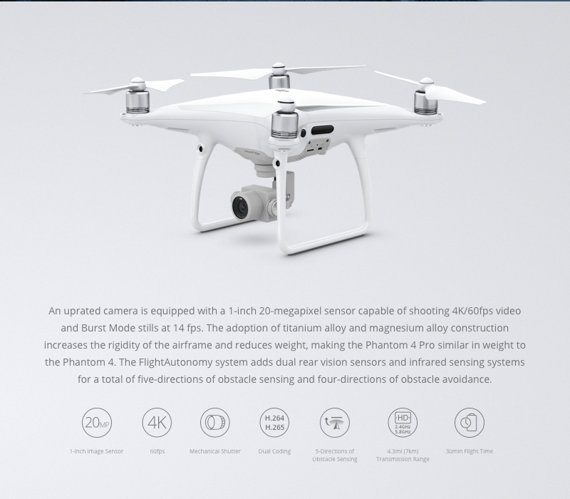 The onboard camera has been redesigned to use a 1-inch 20-megapixel CMOS sensor. A custom engineered lens made up of eight elements is arranged in seven groups, it is the first DJI camera to use a mechanical shutter, eliminating rolling shutter distortion which can occur when taking images of fast moving subjects or when flying at high speed. In effect, it is as powerful as many traditional ground cameras. More powerful video processing supports H.264 4K videos at 60fps or H.265 4K at 30fps, both with a 100Mbps bitrate. Advanced sensors and processors